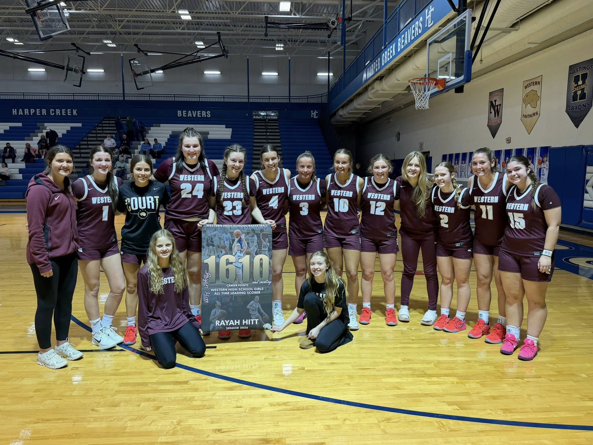 Rayah Hitt and team celebrate Hitt becoming the all-time leading scorer at Western HS.