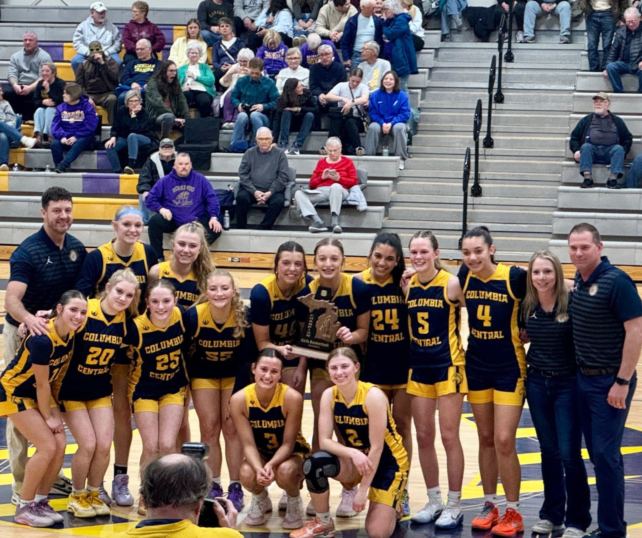 Brooklyn Columbia Central 53, Blissfield 42: The Golden Eagles win their 2nd district championship in the last 3 seasons, and also beat Blissfield for the second time in three years at Onsted on Friday. CC is now 20-4 and will face D3’s #1 team, Jackson Lumen Christi, on their home floor in the Regional Semifinal on Monday (3/9).