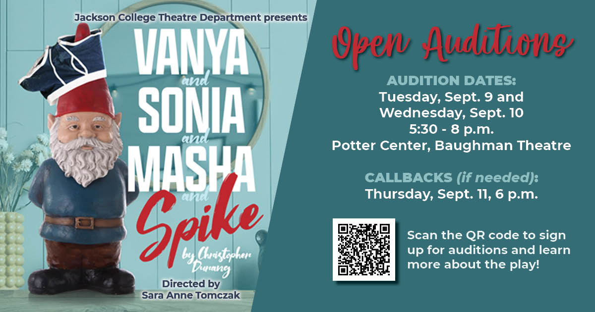 (August 28, 2025 2:32 PM ET) Jackson College invites students and community members to audition for the comedy “Vanya and Sonia and Masha and Spike” by Christopher Durang, the fall production directed by theatre faculty member Sara Anne Tomczak. Auditions will be held Sept. 9–10, from 5:30 to 8:30 p.m., in the Michael Baughman Theatre, Potter Center.