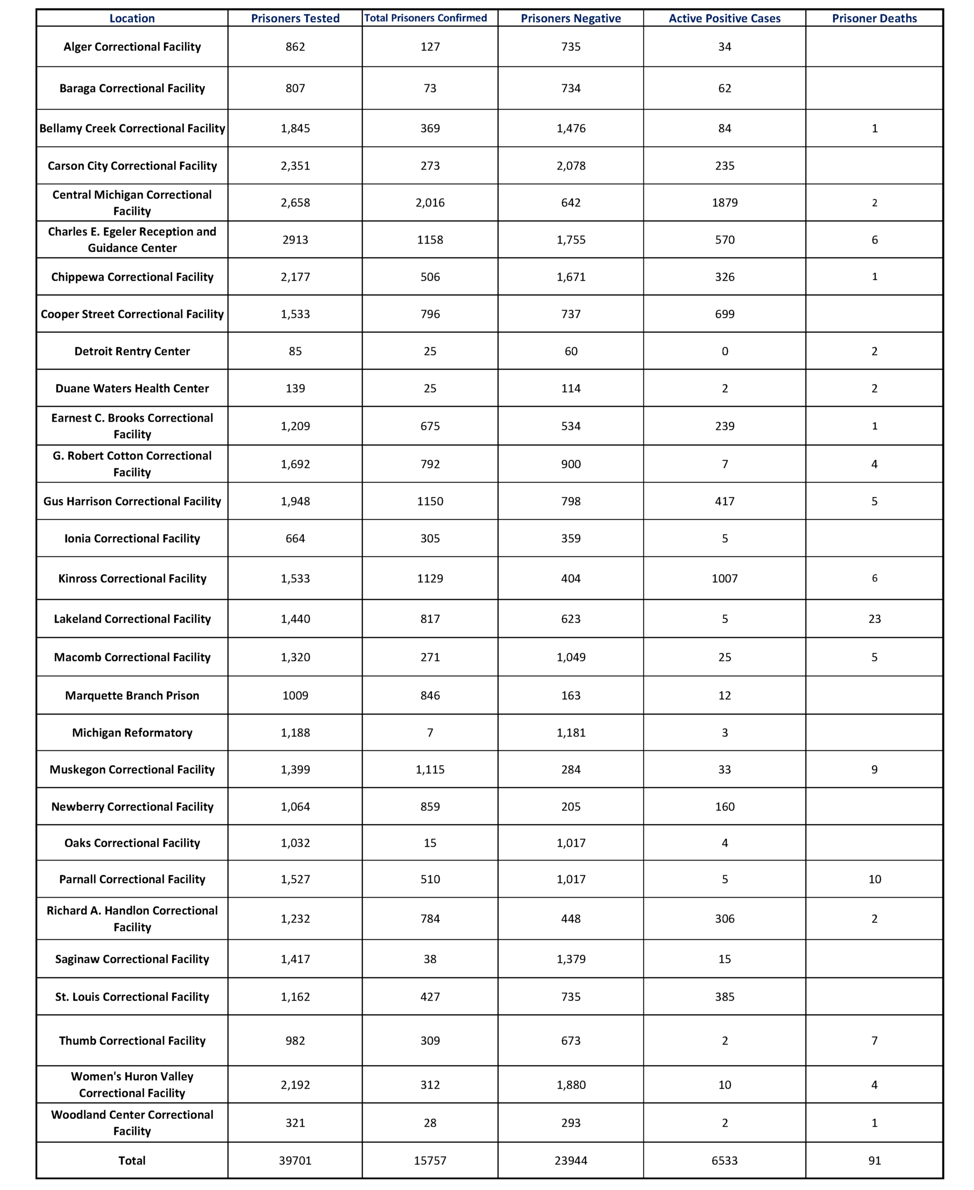 There have been a total of 91 deaths (statewide) of prisoners who had tested positive for COVID-19, 22 of those deaths were among prisoners at Jackson facilities.