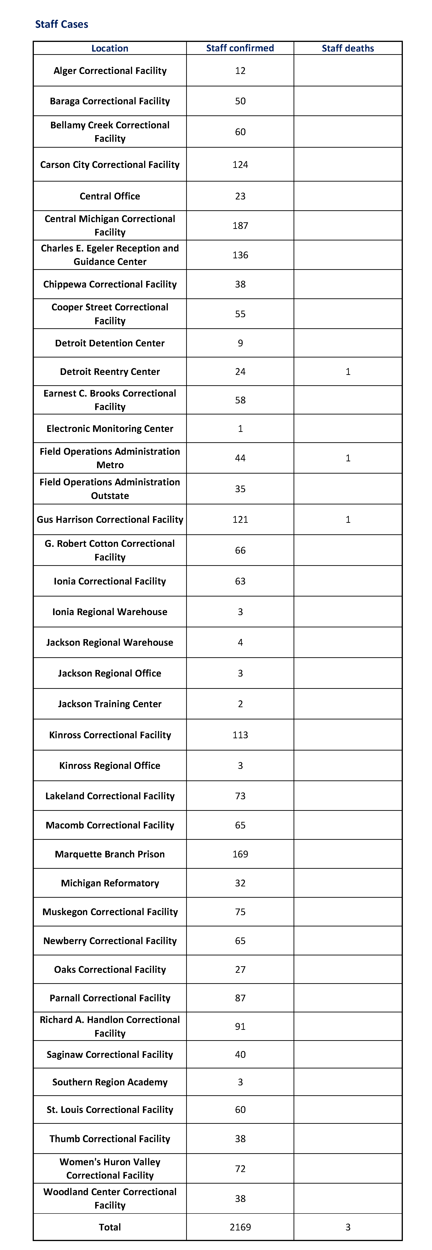 Among staff, there are a total of 2,160 COVID-19 positive cases statewide. In Jackson, there are 136 confirmed positive COVID-19 cases among employees at Charles E. Egeler Reception and Guidance Center, 55 at Cooper Street Correctional Facility, 66 at G. Robert Cotton Correctional Facility, 4 at Jackson Regional Office, 2 at Jackson Training Center, and 87 at Parnall Correctional Facility.